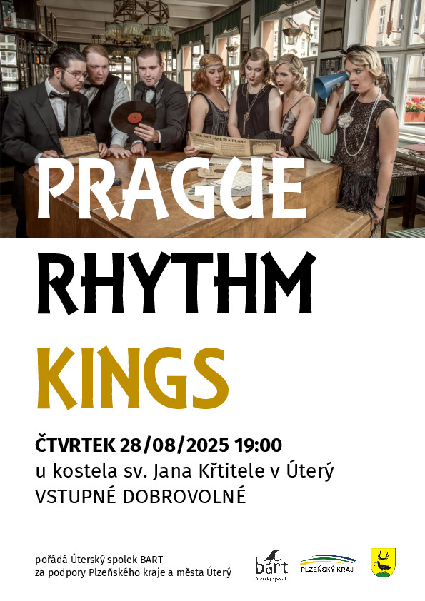 Jazz dvacátých let minulého století už patří k létu v Úterý, a to díky koncertům legendárního orchestru Prague Rhythm Kings. Jejich chytlavé melodie ve čtvrtek 28. srpna od 19:00 návštěvníky opět okouzlily, tentokrát kvůli počasí nikoli u kostela, ale ve spolkovém domě Turbovna.